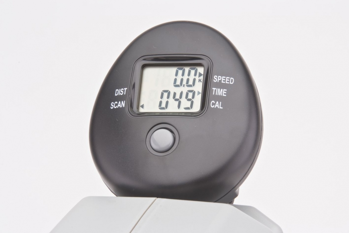 Тренажер оснащен электронным монитором, эргономичными педалями и регулятором сопротивления усилия.