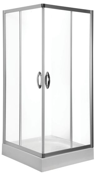 Душевой уголок с поддоном. Раздвижные двери, двойные ролики из нержавеющей стали, цвет профиля – матовый хром, цвет стекла – прозрачное, сифон и ножки в комплекте, комплект ручек из коллекции Inspire (2 шт.), размер: 90x90x206 см.