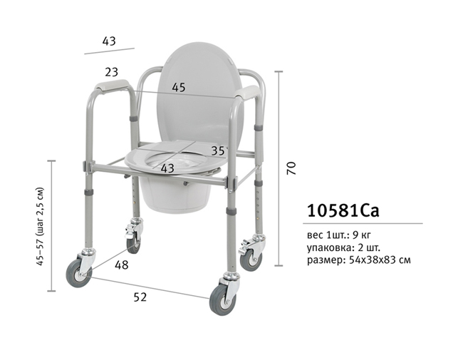 Кресло-туалет имеет регулировку по высоте. Выдерживает нагрузку до 115 кг, при этом само изделие весит всего 9 кг. Съемные судно, стульчак и накладки на подлокотниках обеспечивают удобство чистки.