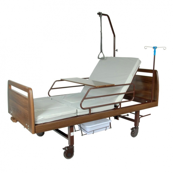 Положение пациента регулируется с помощью механического привода. Поворотная ручка находится в подножье кровати. Данная функция позволяет создавать для пациента максимально комфортные удобные условия.
