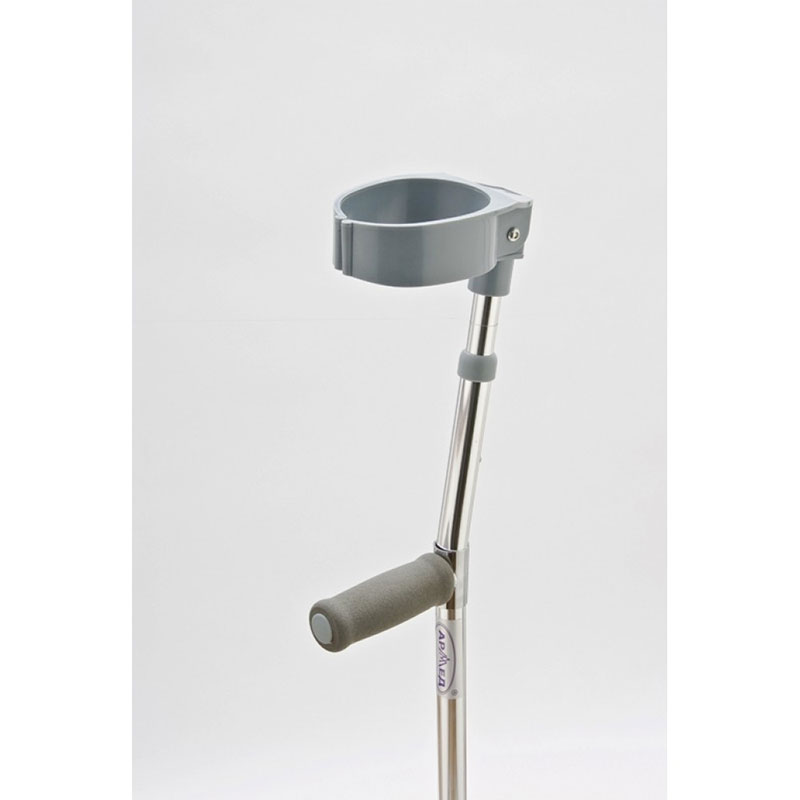 Костыль с опорой под локоть изготовлен из легкого, прочного и устойчивого к коррозии алюминиевого сплава.