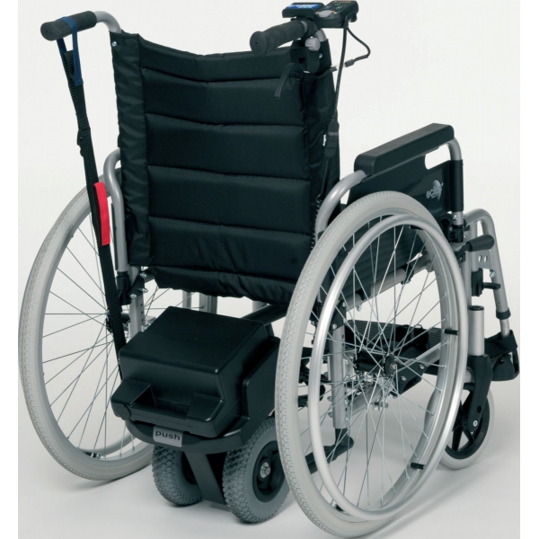 Электропривод для помощи толкания механических колясок. Устройство V-drive просто и быстро преобразует обычное механическое инвалидное кресло в коляску с электроприводом, облегчая процесс передвижения.