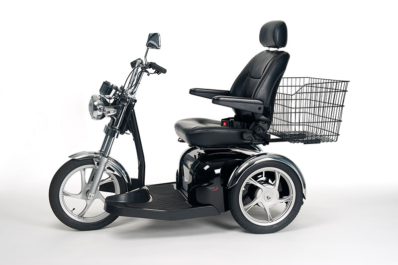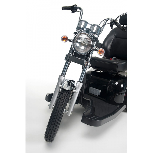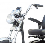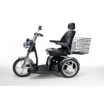 Скутер для инвалидов Sportrider - это электрическая трехколесная модель. Ее отличает стиль ретро. Передняя вилка скутера и колеса имеют хромированные крылья. Мото-стиль поддерживает большая фара, защитные крылья, тормоза на рукоятках, приборная панель. На Sportrider можно проколесить 60 км на одной подзарядке при скорости 15 км/час. Батарея этой модели имеет наибольшую емкость.