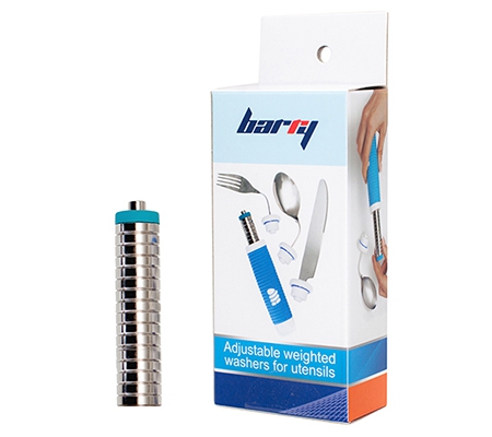 Для определения оптимального веса столового прибора (вилка арт.10926, ложка арт.10927, нож арт.10928), повесьте некоторое количество утяжелителей на насадку. Комбинируйте утяжелители из стали и термопластичной резины (TPR-геля). Далее поместите насадку с утяжелителями в столовый прибор. Придайте дополнительный вес столовому прибору при необходимости.