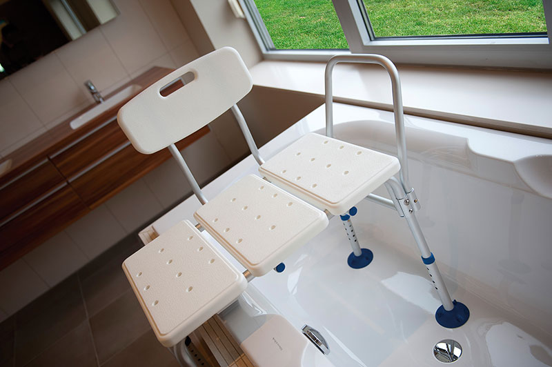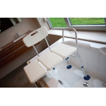 Стул - скамейка для ванной Vermeiren Kate изготовлен в виде каркаса из алюминиевых трубок с гигиеническим нескользящим сиденьем и спинкой. Стул для ванны может использоваться как дома, так и в учреждениях социальной зашиты, больницах, госпиталях итд. Ножки снабжены телескопическими втулками, позволяющими изменять высоту сидения, и резиновыми нескользящими наконечниками. Наконечники ножек выполнены из каучука. Модель имеет специальное противоскользящее сиденье. Также дополнительный комфорт обеспечивает наличие спинки и специальный подлокотник. Сиденье и спинка выдерживают высокий температурный режим.